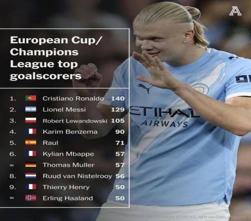 亨利(Thierry Henry)| 法国 | 退役 | 48 进球数:50 哈兰德(Erling Haaland)| 挪威 | 曼城 | 25 进球数:50