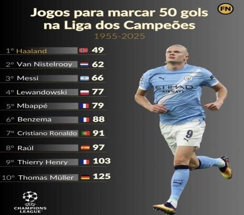 欧冠赛场打进50球所需场次哈兰德(Erling Haaland)| 挪威 | 曼城 | 25 场次:49 场均进球:1.02 范尼(Ruud van Nistelrooy)| 荷兰 | 退役 | 49 场次:62 场均进球:0.81 梅西(Lionel Messi)| 阿根廷 | 迈阿密国际 | 38 场次:66 场均进球:0.76